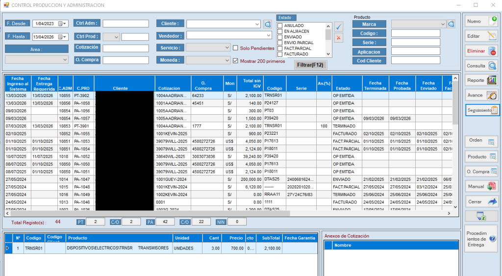 Paso 2: Se nos abrirá este panel donde se vera las producciones registradas en el sistema.