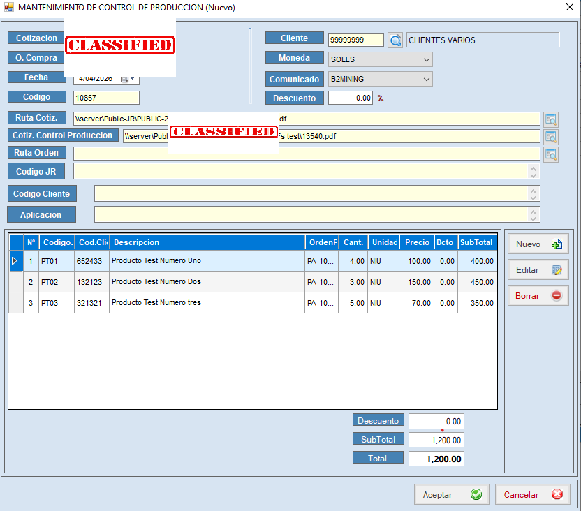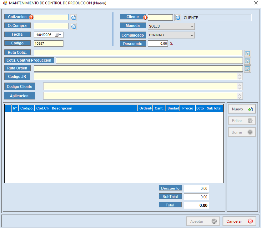 Paso 3: Para generar un documento de control de producción , nos dirigimos al botón de nuevo, para que se nos abra un formulario.
